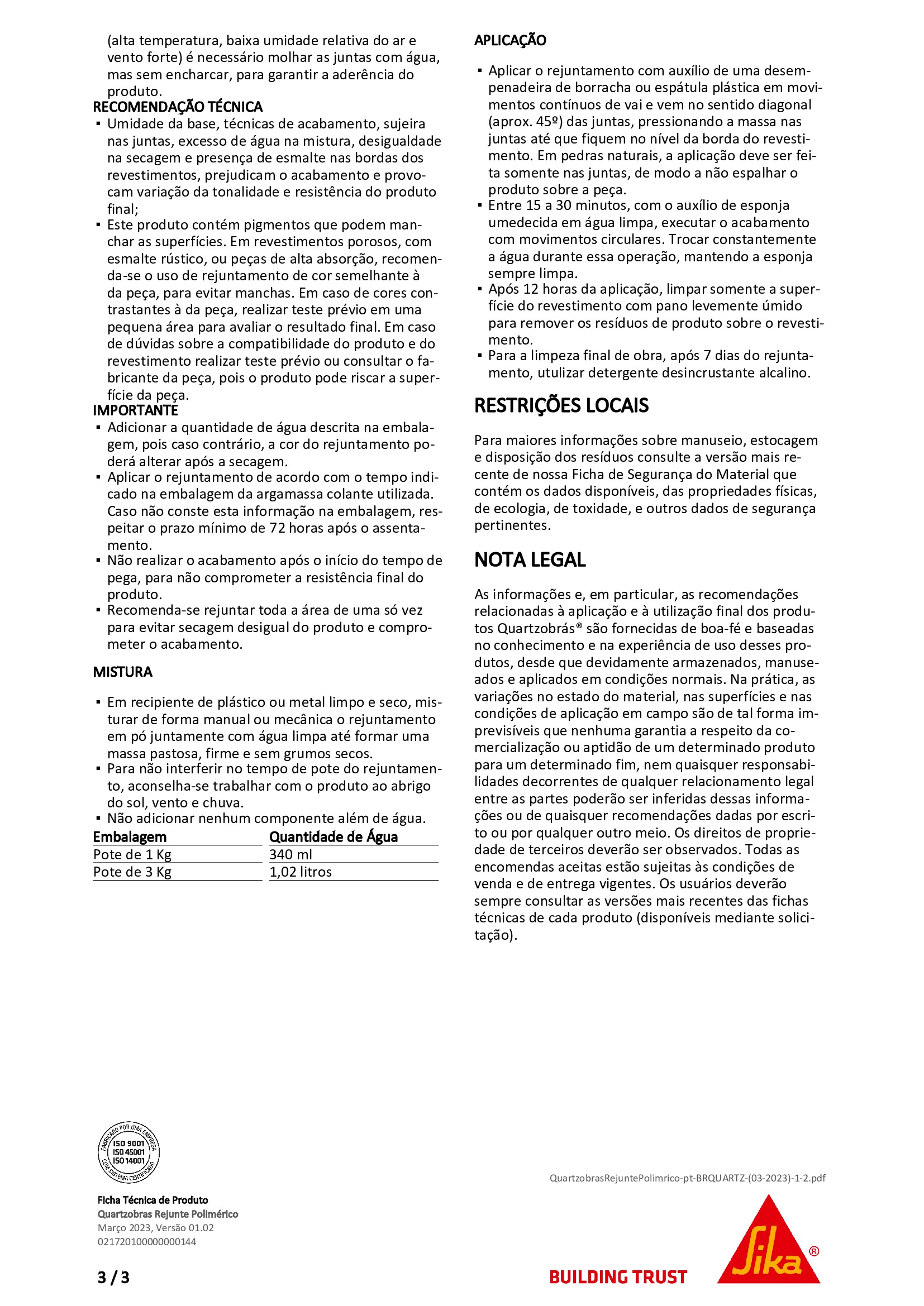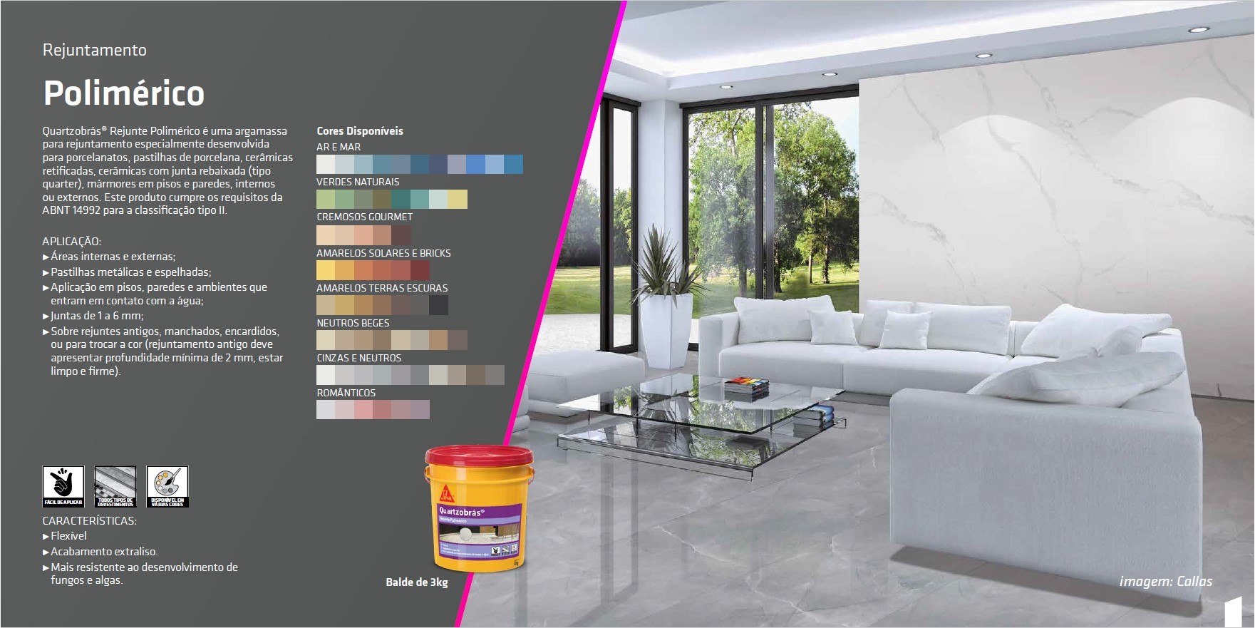 - Aplicação em pisos, paredes e ambientes que entram em contato com a água;